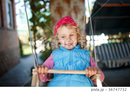 Adorable little girl having fun on a swing outdoor