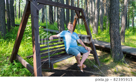 Portrait of an adult man resting in the park on a wooden swing on a summer day