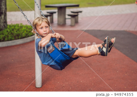 Portrait of little unhappy boy swinging in colorful swing at park. Kids playing outdoors, children having fun, summer vacation and holiday.
