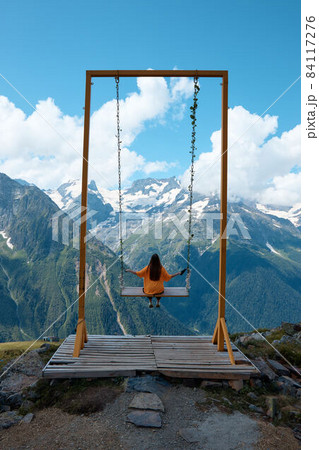 a girl rides a swing in the mountains, a landscape of mountains, alpine meadows and peaks in ice