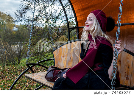 A joyful lady sits on a garden swing, forged in a burgundy coat and biret, an adult looking at the camera, in the fall against the background of a pond, a blue sky.