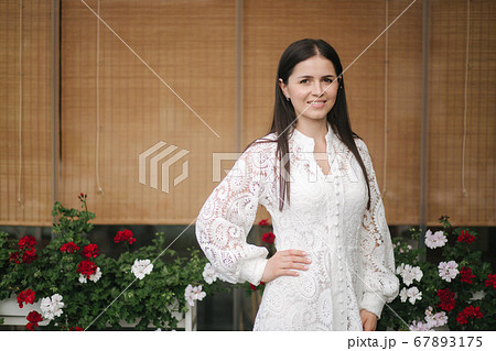 Portrait of beautiful woman in white dress outdoors. Attractive brunette in front of cafe