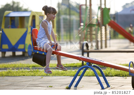 Cute young child girl outdoors on see-saw swing on sunny summer day.