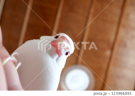 カメラを覗き込む白文鳥