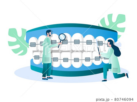 Doctor orthodontist examining teeth with braces, vector illustration. Dental brackets. Orthodontics, bite correction.