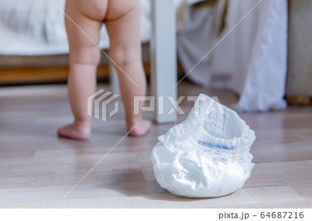 the baby and the diaper. The baby learned to walk on a potty. Used material. Concept of a healthy digestive system, helping parents, toilet training