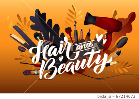 Beauty Salon. Colorful Makeup and Hair Style decorative illustration with haircut accessories and Make-up equipment with big white letters. Realistic Poster.