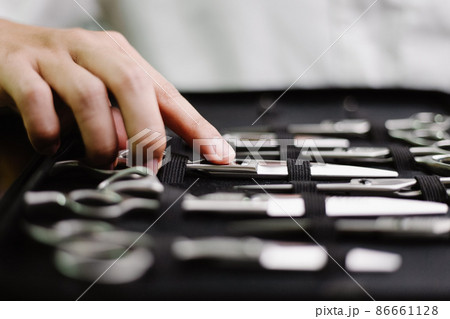 Hair salon concept a collection of scissors made of stainless in different sizes kept in specific leather case