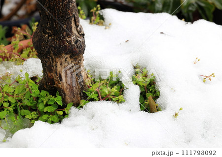 春待ちの雪が積もったドウダンツツジの新芽 岡山県岡山市東区