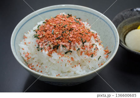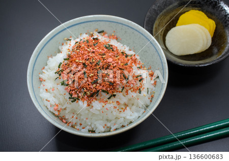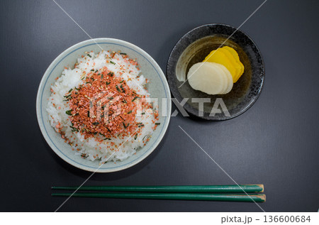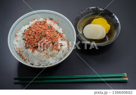 たらこふりかけご飯をべったら漬けとたくあんで食す