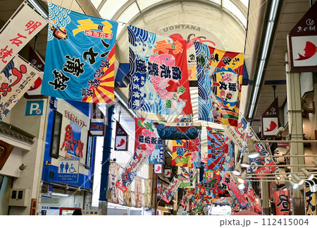 【兵庫・明石】魚の棚商店街。大漁旗が飾られた商店街、大勢の人で賑わい本場の明石焼も美味しかった。