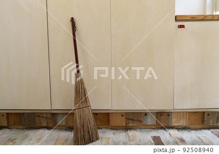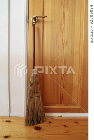 玄関に立て掛けてある柄の短い混穂ほうき 掃除道具