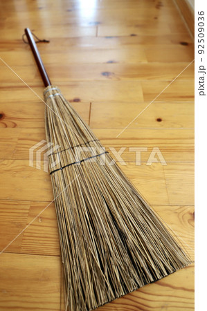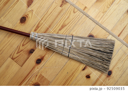 フローリングに置いた柄の短い混穂ほうき 掃除道具