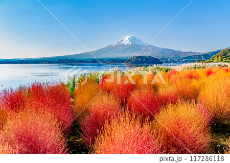 【山梨県】河口湖大石公園 遊歩道の紅葉したコキアと富士山
