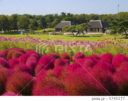 ひたち海浜公園みはらしの丘のコキアとコスモスの花畑