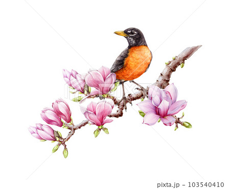 American robin on magnolia tree branch. Watercolor illustration. Hand painted american robin with blooming magnolia flowers decor. Beautiful bird with spring flowers decoration. White background