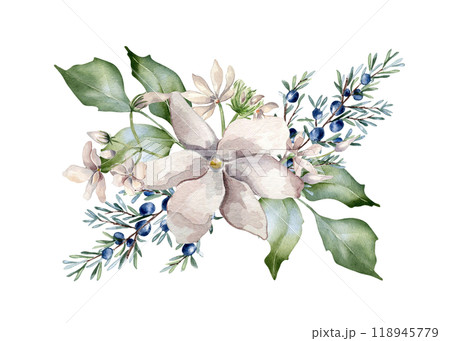 Jasmine pink flowers and juniper branch watercolor illustration isolated. Floral composition in soft tones in botanical style hand drawn. Blooms and coniferous plants painted for wedding, Christmas.