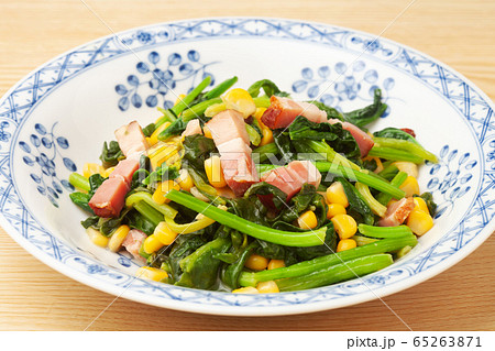 コーンとほうれん草とベーコンのソテー。(白バック)