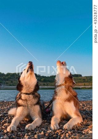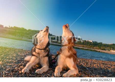 Siberian husky howling. Husky dogs lie.