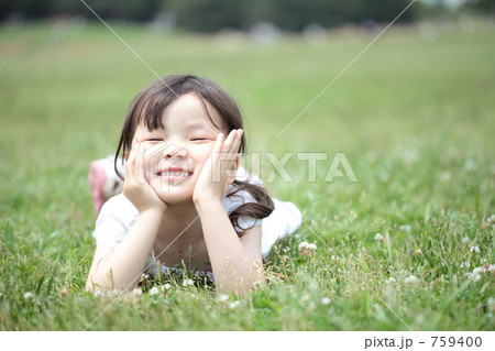 芝生の上にねそべる少女
