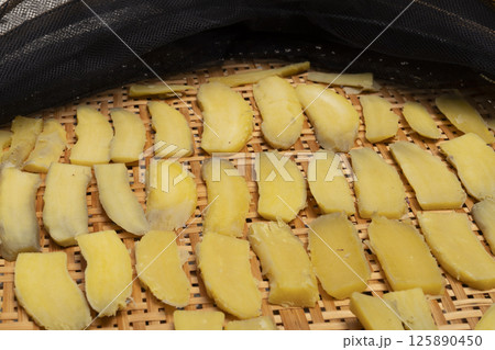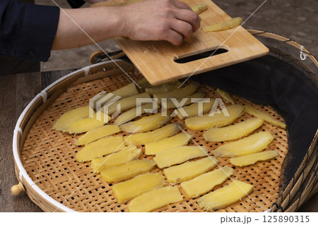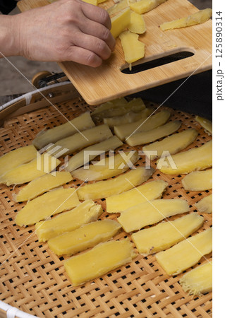 干し芋を作る工程 干しざるに並べたサツマイモを天日干しにする