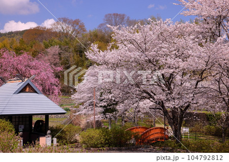 山梨県南アルプス市平岡 桜満開のほたるみ橋公園のソメイヨシノとベニシダレザクラと漆川の水車小屋の景色