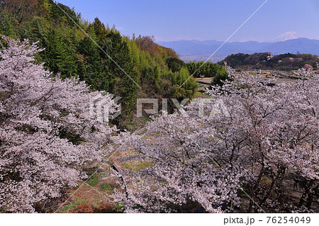 山梨県南アルプス市上市之瀬 ほたるみ橋公園近くの果樹園に咲く桜と富士山を望む景色