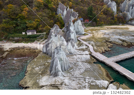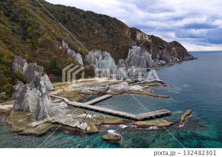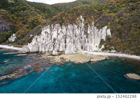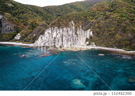 仏ヶ浦の迫力ある奇岩と美しい海と紅葉 青森県佐井村(ドローンによる空撮)