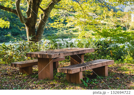 高浪の池湖畔の木製ベンチ