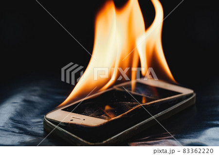 burning broken smartphone on a black background.