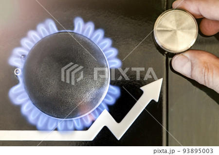 Gas price. Supply chains and the energy gas crisis. Gas stove with a burning flame and a graph arrow pointing up. Man's hand adjusts the gas supply
