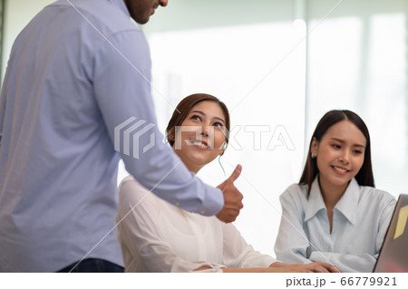 Happy asian woman employee feeling enjoy with praise by boss at meeting in creative office workplace