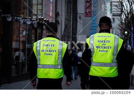 繁華街の客引き等の見回りをする体格のいい外国人パトロール隊が歩いている風景