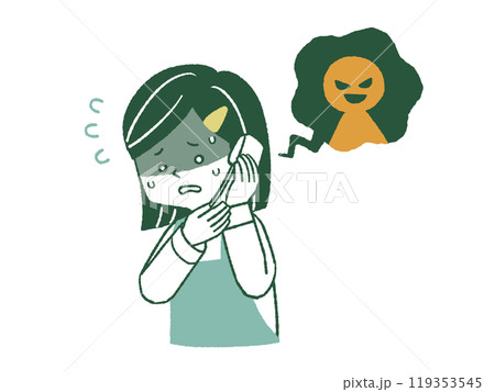 悪意のある電話を受けるエプロンを着用した女性-4色