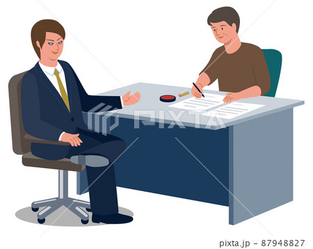 悪い保険会社に騙されて契約書にサインをする男性のベクターイラスト