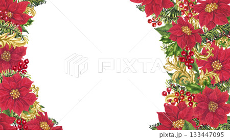 Watercolor Frame with pine branches, poinsettias, and Christmas ornaments. Illustration of Xmas Template with garlands and poinsettia for New Year greeting cards or party invitations. Holiday backdrop