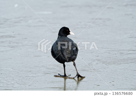 氷上で滑って進めず途方に暮れるオオバン