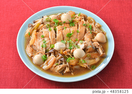 鶏肉(鶏モモ肉)のポン酢醤油煮。ポンズしょう油煮。うずらの玉子を添えて。