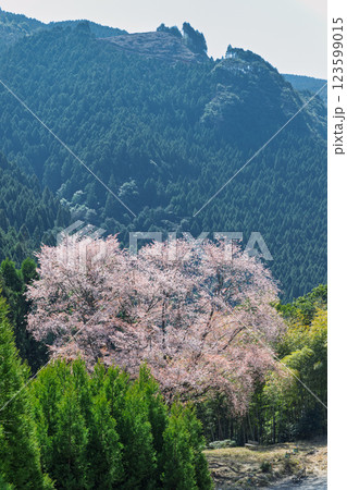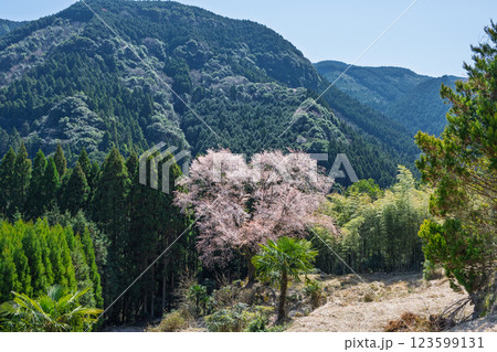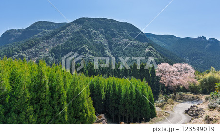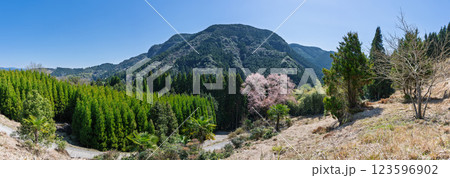 パノラマ風景 毎床大桜(まいとこおおざくら)樹齢三百年 杉林の中に一本だけ咲いた山桜(人吉・球磨)