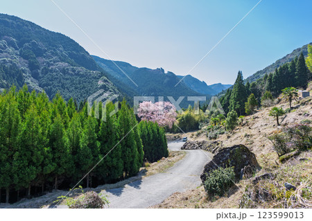 春日和に映える毎床大桜(まいとこおおざくら)樹齢三百年 杉林の中に一本だけ咲いた山桜(人吉・球磨)