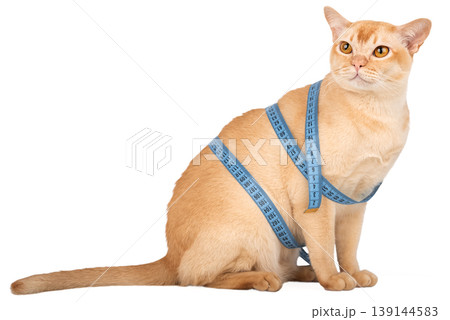 Burmese cat with measuring tape isolated on white background pet weight control