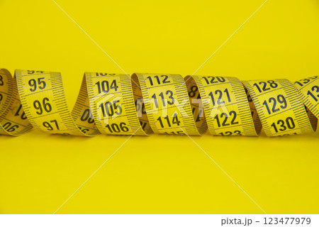 Yellow tape measure diet concept on yellow background with copyspace