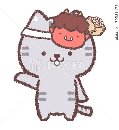 節分お面をかぶる案内ネコ吹き出し線画