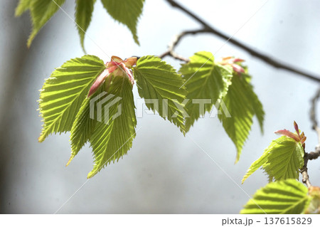 アカシデ(Carpinus laxiflora)の若葉 春の光に透ける新緑 東北
