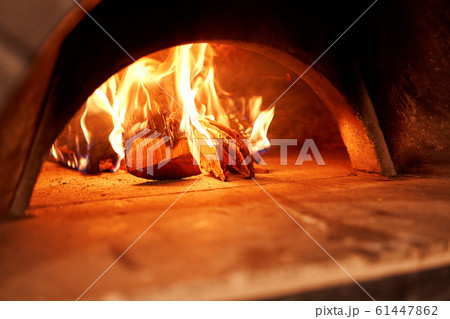 Firewood is burning, the stove is being heated. Red hot coal. Traditional wood oven in Naples restaurant, Italy. Original neapolitan pizza.