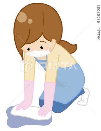 マスク・ゴム手袋・エプロンをして嘔吐物を処理する女性