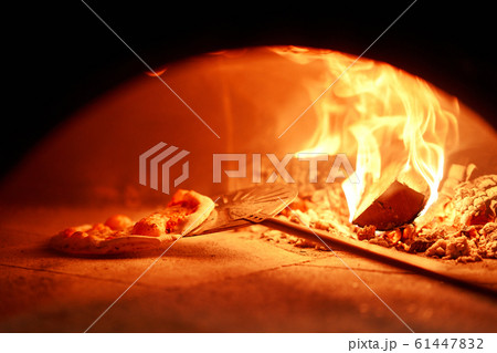 Pizza with toppings in a hot stone oven