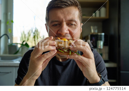 Man takes big bite of seeded bagel filled with egg, cheese, tomato and greens. Hungry man eats sandwich at kitchen, close up