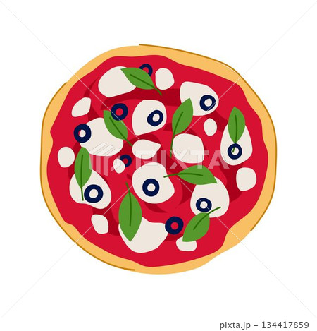 Italian pizza top view with mozzarella olives basil