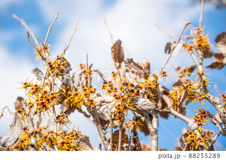 早春の森林で咲くオレンジ色のマンサクの花 イェレナ
